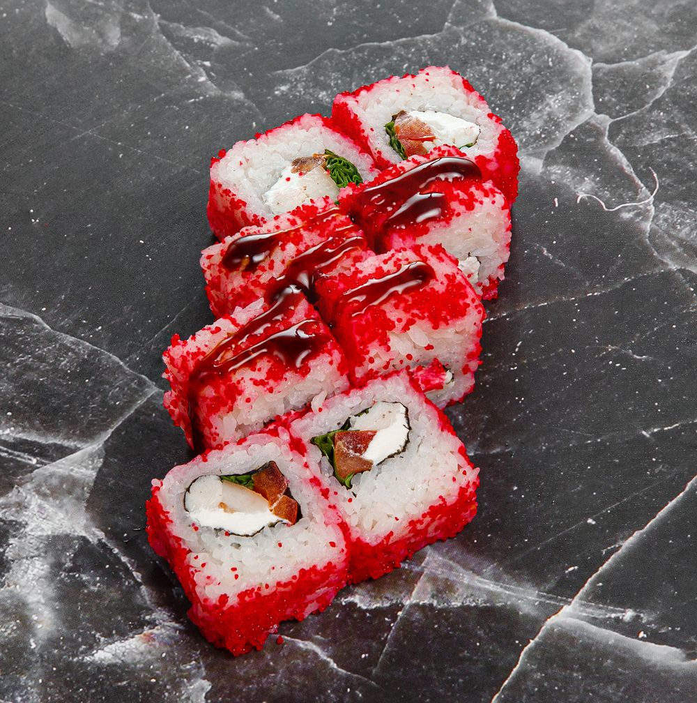 Рис, Нори, Сыр творожный, Курицы копченая, Помидор, Лист салата, Тобико (Икра летучей рыбы), Соус терияки, Кунжут.